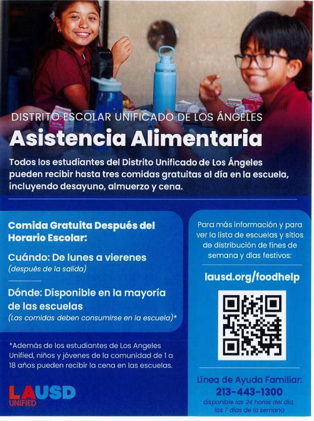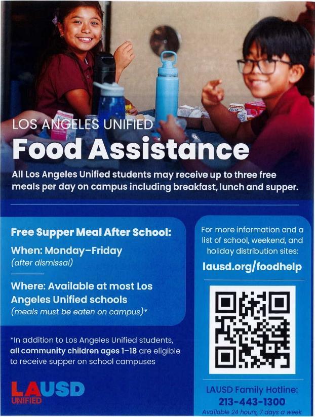 LAUSD Food Assistance/ Asistencia Alimentaria All Los Angeles Unified students may receive up to three free meals per day on campus including breakfast, lunch, and supper. When: Monday - Friday (after dismissal) ------------------------------------------------------------------------------ Todos los estudiantes del Distrito Unificado de los Angeles pueden recibir hasta tres comidas gratuitas al dia en la escuela, incluyendo desayuno, almuerzo y cena; Cuando: de lunes a viernes (despues de la salida)